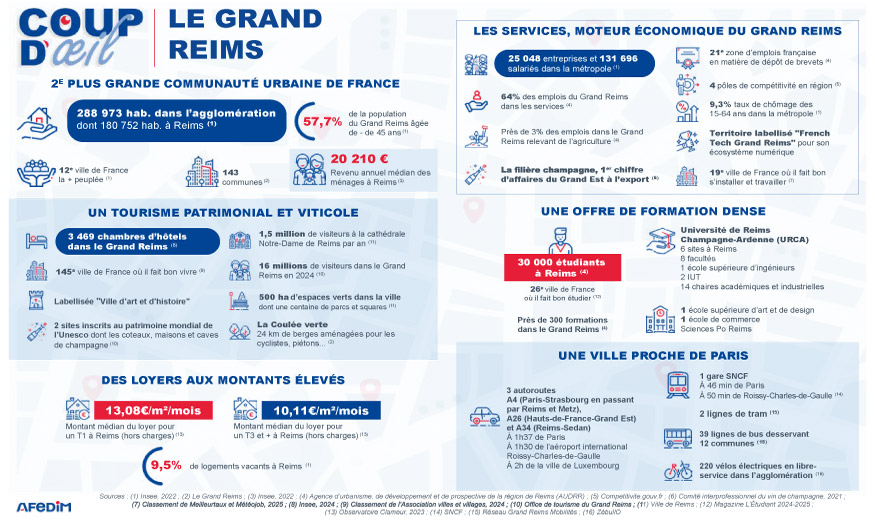 Reims, ville de 183 000 habitants au riche passé historique, continue de séduire autant les visiteurs que les investisseurs. Capitale du champagne et ville de sacres royaux, elle bénéficie d’un patrimoine remarquable et d’un cadre de vie attractif. Sa situation stratégique, à seulement 45 minutes de Paris en TGV, en fait un carrefour prisé entre Île-de-France, Grand Est et Nord. Entre dynamisme économique – porté par l’industrie, la recherche et l’agroalimentaire – et qualité de vie, Reims confirme son statut de marché immobilier solide, mêlant tradition et modernité.