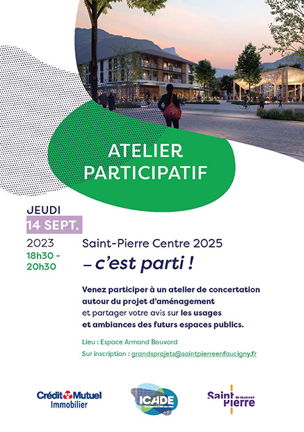 Le Jeudi 14 septembre à 18h30 se tiendra à l’Espace Armand Bouvard de Saint-Pierre-en-Faucigny un premier atelier de participation à destination des Saint-Pierrois et des Saint-Pierroises afin de co-concevoir avec eux le nouveau projet d'aménagement foncier "Saint-Pierre Centre 2025".