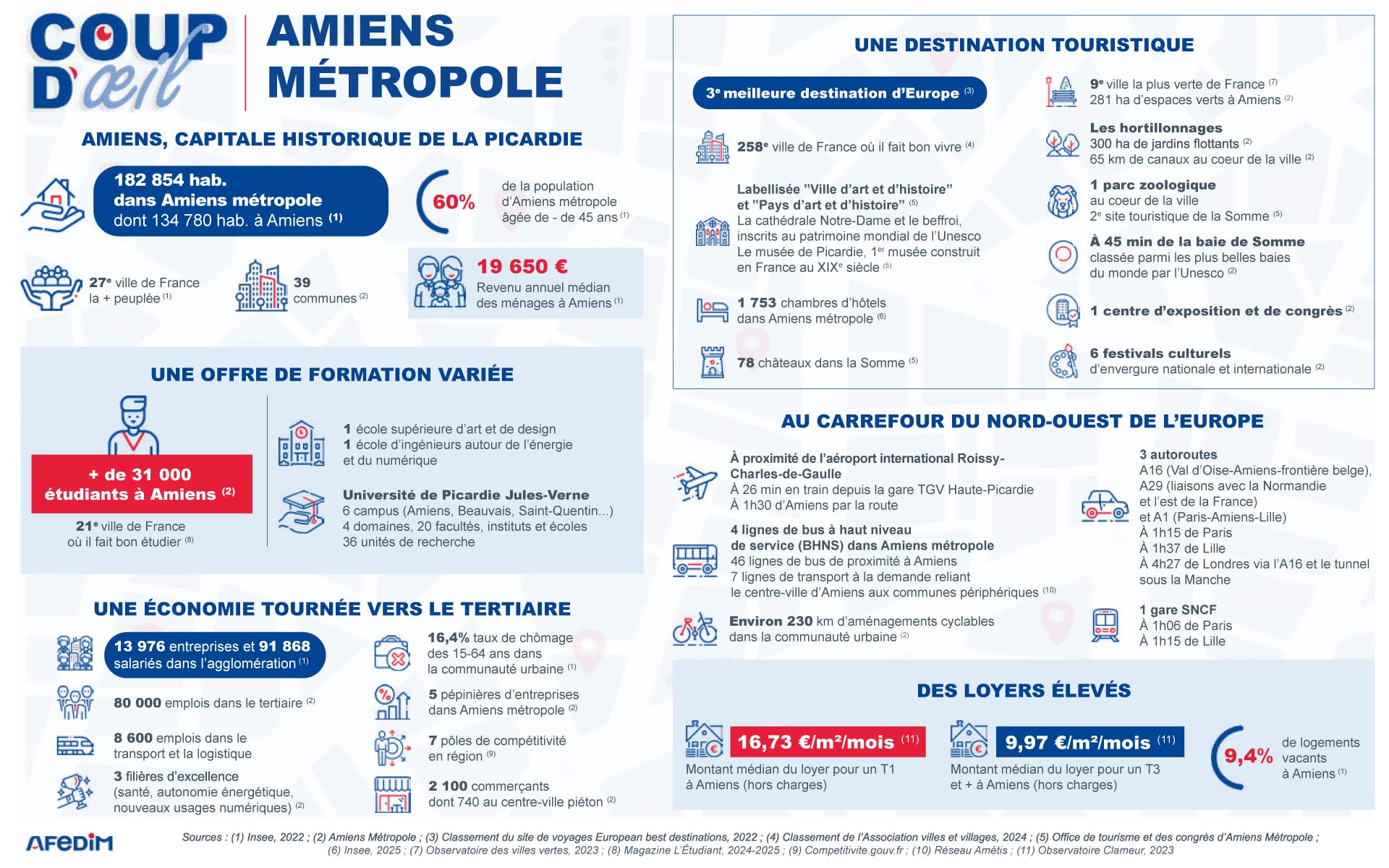 Sources : (1) Insee, 2022 ; (2) Amiens Métropole ; (3) Classement du site de voyages European best destinations, 2022 ; (4) Classement de l’Association villes et villages, 2024 ; (5) Office de tourisme et des congrès d’Amiens Métropole ; (6) Insee, 2025 ; (7) Observatoire des villes vertes, 2023 ; (8) Magazine L’Étudiant, 2024-2025 ; (9) Competitivite.gouv.fr ; (10) Réseau Amétis ; (11) Observatoire Clameur, 2023