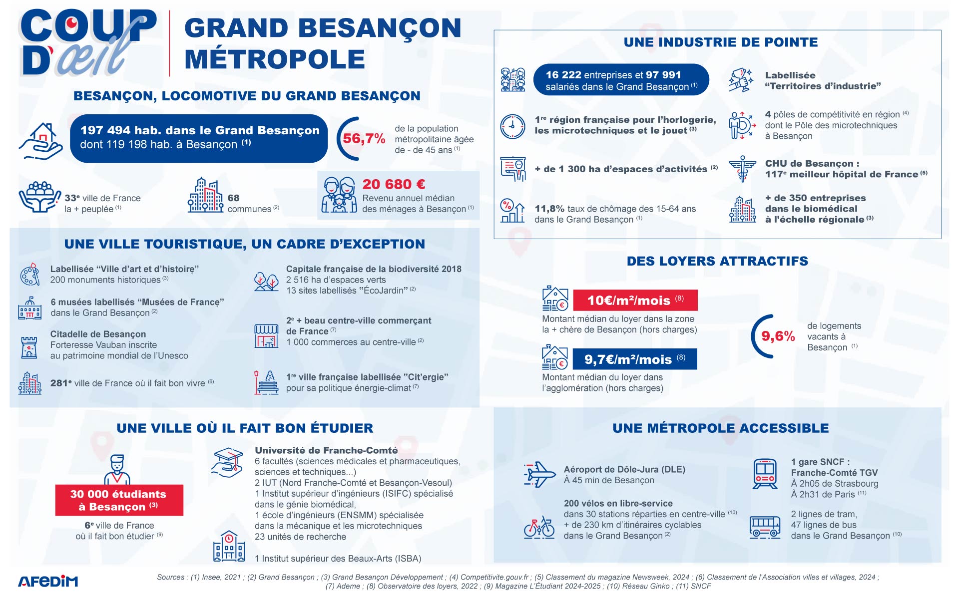 Sources : (1) Insee, 2021 ; (2) Grand Besançon ; (3) Grand Besançon Développement ; (4) Competitivite.gouv.fr ; (5) Classement du magazine Newsweek, 2024 ; (6) Classement de l’Association villes et villages, 2024 ; (7) Ademe ; (8) Observatoire des loyers, 2022 ; (9) Magazine L’Étudiant 2024-2025 ; (10) Réseau Ginko ; (11) SNCF