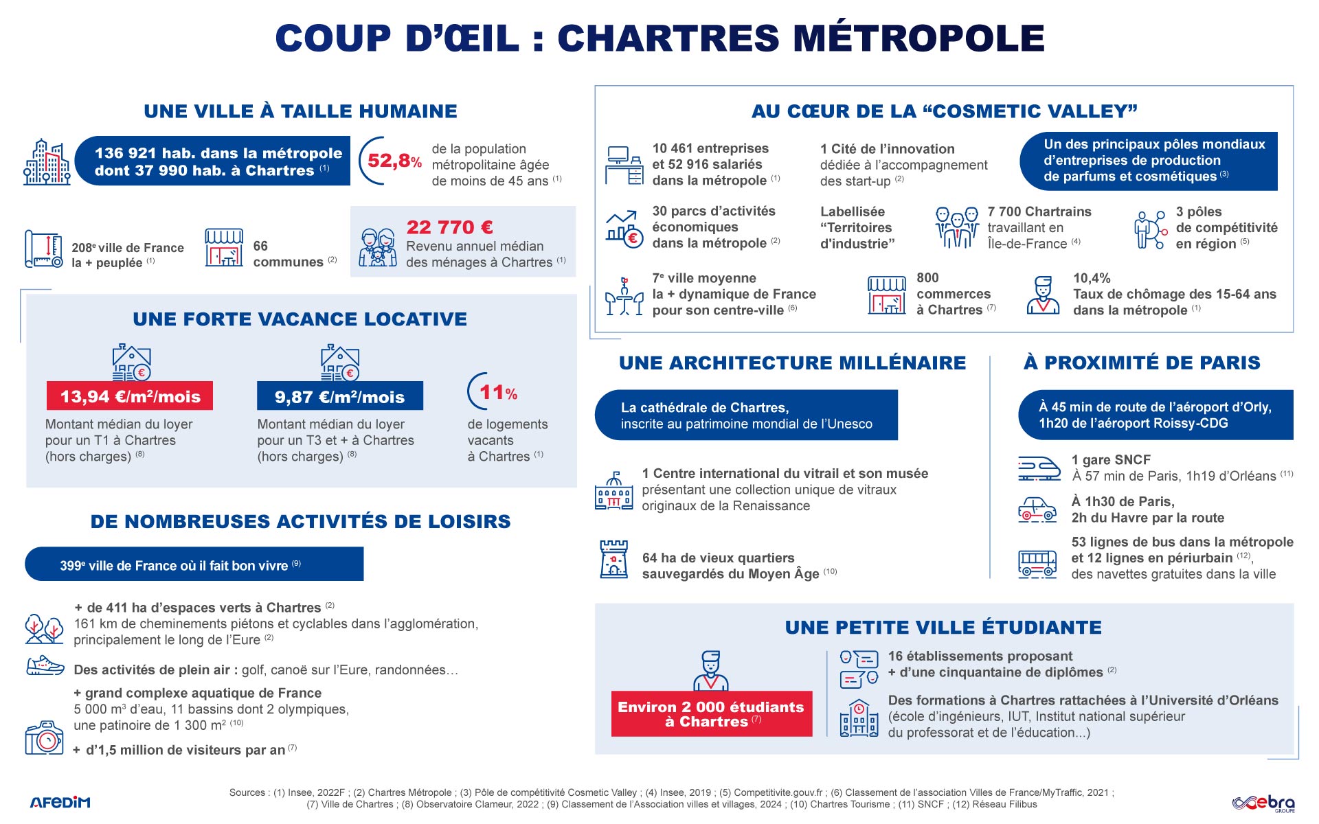 Sources : (1) Insee, 2022F ; (2) Chartres Métropole ; (3) Pôle de compétitivité Cosmetic Valley ; (4) Insee, 2019 ; (5) Competitivite.gouv.fr ; (6) Classement de l’association Villes de France/MyTraffic, 2021 ; (7) Ville de Chartres ; (8) Observatoire Clameur, 2022 ; (9) Classement de l’Association villes et villages, 2024 ; (10) Chartres Tourisme ; (11) SNCF ; (12) Réseau Filibus