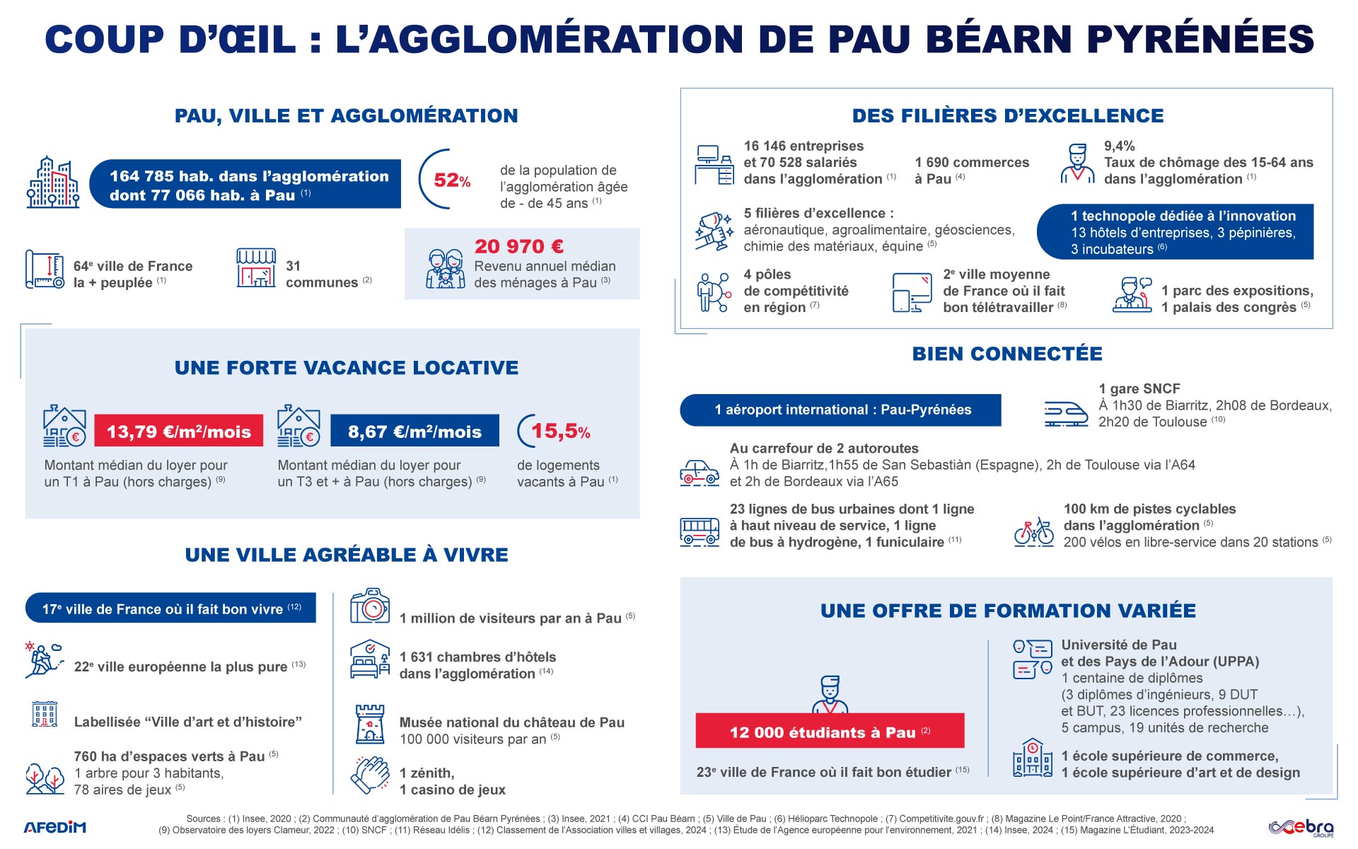 Sources : Notaires de France (avril 2024 à mars 2025), Afedim, (1) Insee, 2020 ; (2) Communauté d’agglomération de Pau Béarn Pyrénées ; (3) Insee, 2021 ; (4) CCI Pau Béarn ; (5) Ville de Pau ; (6) Hélioparc Technopole ; (7) Competitivite.gouv.fr ; (8) Magazine Le Point/France Attractive, 2020 ; (9) Observatoire des loyers Clameur, 2022 ; (10) SNCF ; (11) Réseau Idélis ; (12) Classement de l’Association villes et villages, 2024 ; (13) Étude de l’Agence européenne pour l’environnement, 2021 ; (14) Insee, 2024 ; (15) Magazine L’Étudiant, 2023-2024.
