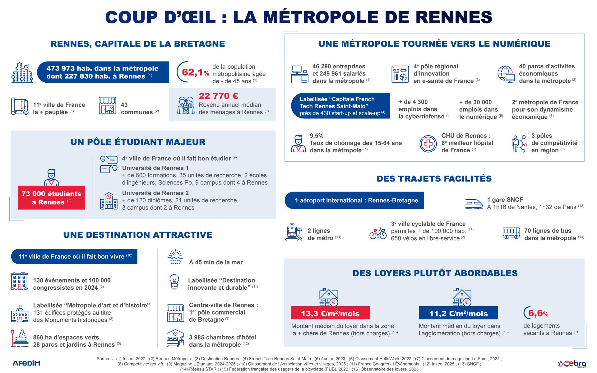 Sources : (1) Insee, 2022 ; (2) Rennes Métropole ; (3) Destination Rennes ; (4) French Tech Rennes Saint-Malo ; (5) Audiar, 2023 ; (6) Classement HelloWork, 2022 ; (7) Classement du magazine Le Point, 2024 ; (8) Competitivite.gouv.fr ; (9) Magazine L’Étudiant, 2024-2025 ; (10) Classement de l’Association villes et villages, 2025 ; (11) France Congrès et Événements ; (12) Insee, 2025 ; (13) SNCF ; (14) Réseau STAR ; (15) Fédération française des usagers de la bicyclette (FUB), 2022 ; (16) Observatoire des loyers, 2023