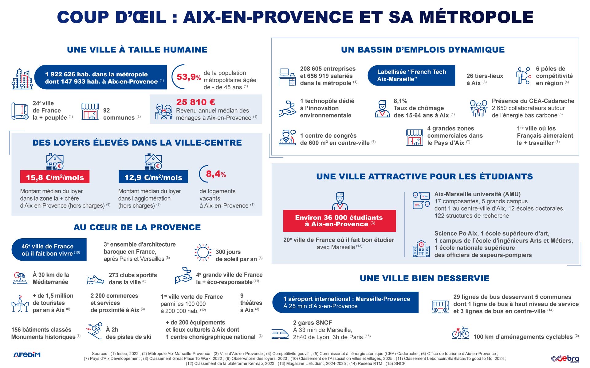 Sources : (1) Insee, 2022 ; (2) Métropole Aix-Marseille-Provence ; (3) Ville d’Aix-en-Provence ; (4) Competitivite.gouv.fr ; (5) Commissariat à l’énergie atomique (CEA)-Cadarache ; (6) Office de tourisme d’Aix-en-Provence ;