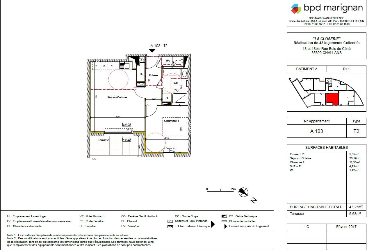 A CHALLANS, dans la résidence La Closerie nous vous y proposons un appartement T2 n°A103 d'une superficie de 43.69m² situé au 1er étage, comprenant : un séjour-cuisine de 20.19m² donnant sur une terrasse de 5.63m², une chambre de 11.36m², une salle d'eau avec placard, WC séparés. Au rez-de-chaussée un box n°7 et un local vélo n°7. Loyer accessoire stationnement 45.00 EUR en sus du loyer de 360.00 EUR (soit 405 EUR hors charge). Eau chaude et chauffage par chaudière gaz individuel. Entretien parties communes, entretien ascenseur et espaces verts communs, compris dans les provisions sur charges mensuelles et donnant lieu à une régularisation annuelle. Les honoraires de location TTC (à la charge du locataire) incluent le montant de rédaction des états des lieux facturé pour 129.00 euros TTC, après réalisation lors de l'entrée dans les lieux. . Pour plus de détails rendez-vous sur notre site internet Afedim Disponible immédiatement