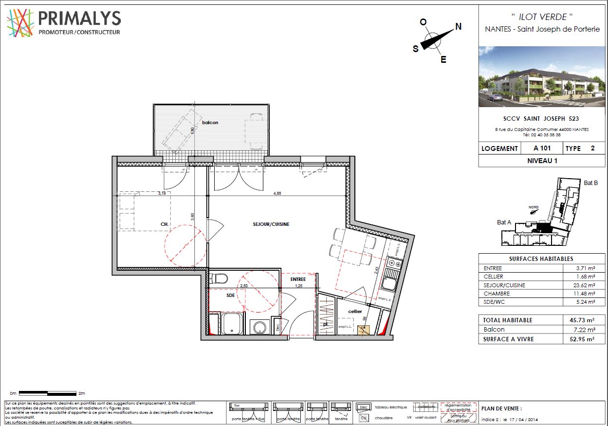 Quartier de Saint Joseph de Porterie, environnement calme et verdoyant, proche de l'Erdre et du Parc de la Roseraie, dans la résidence ILOT VERDE. appartement T2 n° A101 (lot 5) de 45.73m² avec un balcon de 7.22m² situé au 1er étage du bâtiment A, avec ascenseur. Il est composé d'une entrée avec placard, d'un séjour avec cuisine, d'un cellier, d'une chambre et d'une salle d'eau avec WC. Un parking extérieur. Eau chaude, eau froide et chauffage gaz individuels. Entretien parties communes, entretien ascenseur et espaces verts communs, compris dans les provisions sur charges mensuelles et donnant lieu à une régularisation annuelle. Les honoraires de location TTC (à la charge du locataire) incluent le montant de rédaction des états des lieux facturé pour 138 euros TTC, après réalisation lors de l'entrée dans les lieux. Pour plus de détails sur ce logement, vous pouvez consulter la fiche descriptive de ce bien, sur votre site internet AFEDIM