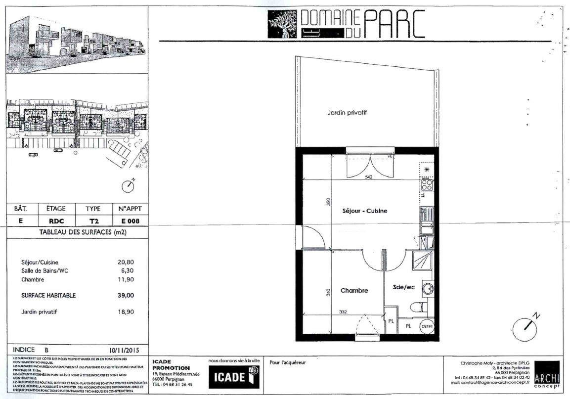 Dans le quartier Sud de Perpignan, à proximité des groupes scolaires (écoles, collège, lycée et université), des infrastructures sportives, médicales et centres culturels, à 5 minutes du bassin d'emplois AGROSUD et TECHNOSUD, et à quelques minutes en voiture des zones commerciales. Nous vous proposons, dans la résidence DOMAINE DU PARC, un appartement de type T2 n° E008 de 39 m². Situé au RDC avec ascenseur, il comprend : un séjour avec cuisine donnant sur un jardin privatif de 18.9m², une chambre et une salle d'eau avec WC. À l'extérieur, une place de stationnement n°24. Eau chaude et chauffage individuel. Eau froide, entretien parties communes, entretien ascenseur et espaces verts communs, compris dans les provisions sur charges mensuelles et donnant lieu à une régularisation annuelle. Les honoraires de location TTC (à la charge du locataire) incluent le montant de rédaction des états des lieux facturé pour 80,00 euros TTC, après réalisation lors de l'entrée dans les lieux. Disponibilité au 09/05/2026