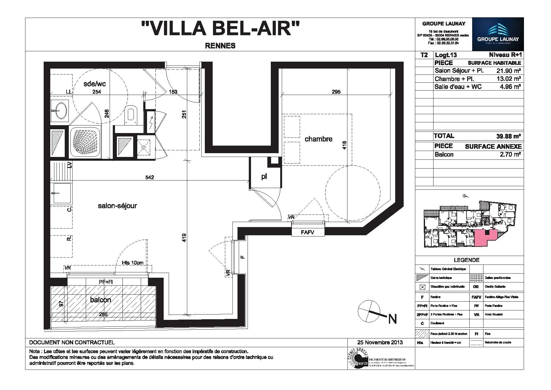 RENNES, dans la résidence Villa Bel Air. Appartement T2 n°13 de 39,88m² situé au 1er étage. Un séjour avec coin cuisine de 21,90m² ouvert sur balcon, une chambre avec placard, une salle d'eau avec WC. Au sous-sol un parking n°3. Eau chaude et chauffage individuel gaz. Eau froide individuelle. Entretien parties communes, entretien ascenseur et espaces verts communs, compris dans les provisions sur charges mensuelles et donnant lieu à une régularisation annuelle. Les honoraires de location TTC (à la charge du locataire) incluent le montant de rédaction des états des lieux facturé pour 120 euros TTC, après réalisation lors de l'entrée dans les lieux.
