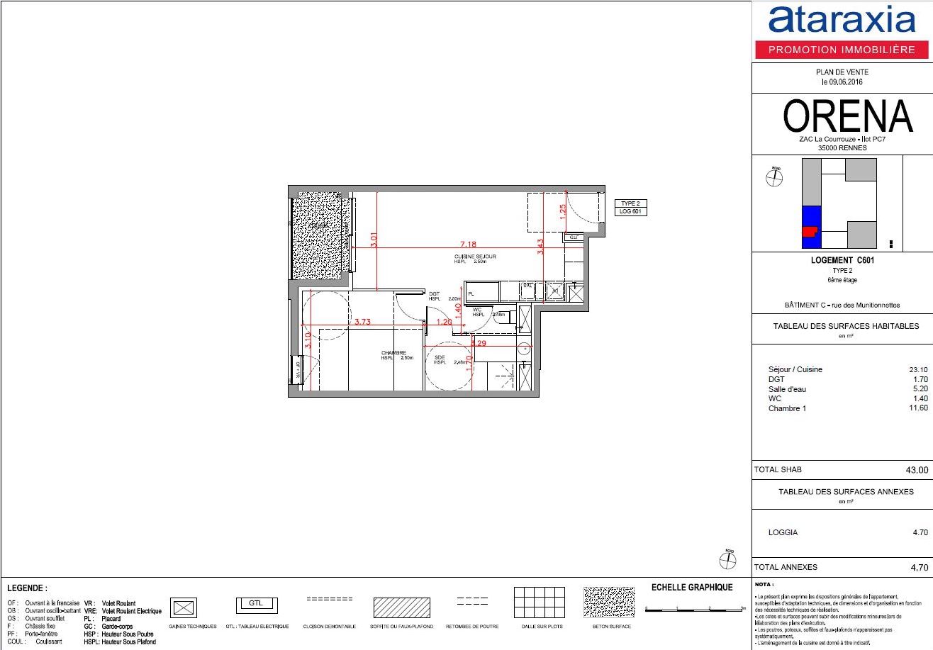RENNES. Dans la résidence ORENA vous est proposé un appartement (n°C601) de type 2 de 43 m² sis au sixième étage avec ascenseur. Il comprend: une entrée donnant sur un séjour-cuisine de 23,1 m² avec placard et accès sur une loggia et donnant sur un dégagement desservant une chambre de 11,60 m², un espace WC, ainsi qu'une salle d'eau. Place de parking n°40 sis au sous-sol. Chauffage et production d'eau chaude par chaudière collective gaz. Eau froide individuelle. Entretien parties communes, entretien ascenseur et espaces verts communs, compris dans les provisions sur charges mensuelles et donnant lieu à une régularisation annuelle. Logement disponible. Les honoraires de location TTC (à la charge du locataire) incluent le montant de rédaction des états des lieux facturé pour 130,00 euros TTC, après réalisation lors de l'entrée dans les lieux. Pour plus de détails sur ce logement, vous pouvez consulter la fiche descriptive de ce bien, sur notre site internet Afedim.