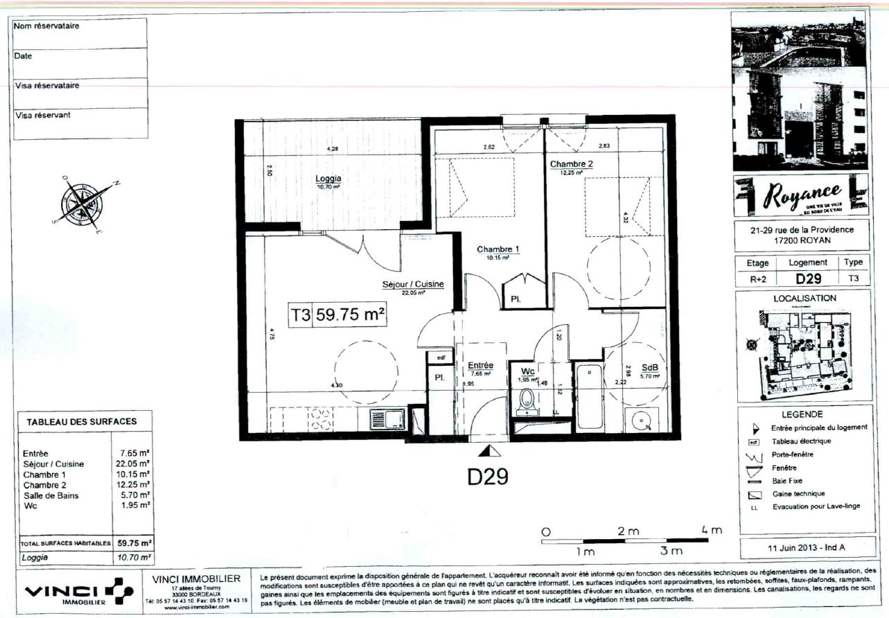 A Royan. RESIDENCE Royance. Nous vous proposons un appartement T3 d'une superficie de 59.75m² situé au 2ème étage avec ascenseur, comprenant : un séjour d'environ 22.05m² avec coin cuisine aménagé, une loggia de 10.70m², deux chambres, une salle de bain avec WC séparés. Au sous-sol, un parking n°211. Eau chaude collective aux panneaux solaires et chauffage individuel électrique. Entretien parties communes, entretien ascenseur et espaces verts communs, compris dans les provisions sur charges mensuelles et donnant lieu à une régularisation annuelle. Les honoraires de location TTC (à la charge du locataire) incluent le montant de rédaction des états des lieux facturé pour 179.00 euros TTC, après réalisation lors de l'entrée dans les lieux. Disponible le 23/11/2025. Pour plus de détails sur ce logement, vous pouvez consulter la fiche descriptive de ce bien, sur votre site internet AFEDIM.