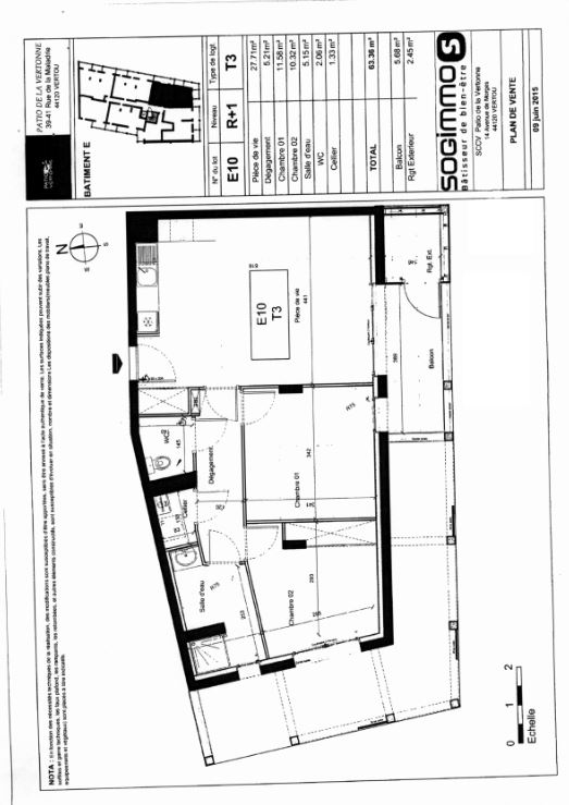 La résidence "PATIO DE LA VERTONNE" est située à Vertou dans le quartier de la Grammoire, à 10 minutes du centre-ville de Nantes. Nous vous proposons un appartement de type T3 n°E10 de 63.36 m². Situé au 1er étage avec ascenseur, il comprend : une pièce de vie de 27.71 m² donnant sur un balcon de 5.68 m², deux chambres dont l'une donnant sur le balcon, une salle d'eau, un cellier, et des WC. Au sous-sol du bâtiment D, deux parkings n°PKSS D08 (lot 50) et n°PKSS D07 (lot 51), et un local vélo n°ELV23 (lot 142) au rez-de-chaussée du bâtiment E. Eau froide, eau chaude et chauffage individuels gaz. Entretien parties communes, entretien ascenseur et espaces verts communs, compris dans les provisions sur charges mensuelles et donnant lieu à une régularisation annuelle. Les honoraires de location 633 EUR TTC et le montant de rédaction des états des lieux facturé 190 EUR. Pour plus de détails sur ce logement, vous pouvez consulter la fiche descriptive de ce bien sur notre site AFEDIM.