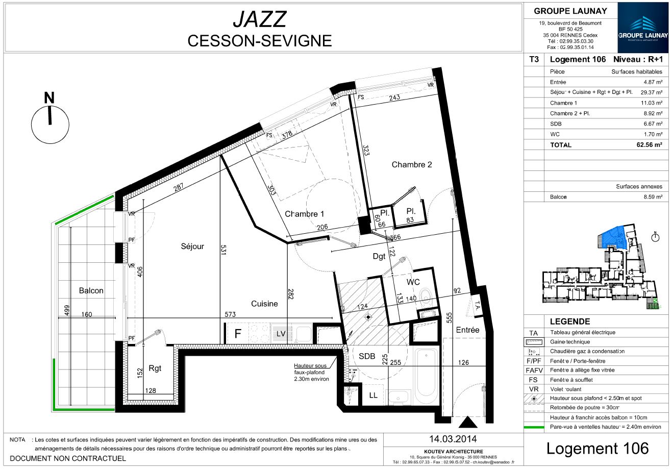 Situé à CESSON SEVINGE, proche de RENNES, dans la résidence JAZZ, un appartement T3 n° 106 (lot 250) de 62.56m² avec balcon de 8.59m², au 1er étage du bâtiment, avec ascenseur. Il est composé d'une entrée avec placard, d'un séjour avec cuisine ouverte aménagée et équipée (meubles hauts et bas, plaques vitrocéramique et hotte) et rangement de 29.37m², de deux chambres dont une avec placard, d'une salle de bains et d'un WC indépendant. Au sous-sol, un parking n° 58 (lot 113). Eau chaude et chauffage (individuel). Entretien parties communes, entretien ascenseur et espaces verts communs, compris dans les provisions sur charges mensuelles et donnant lieu à une régularisation annuelle. Les honoraires de location 820euros TTC (à la charge du locataire) incluent le montant de rédaction des états des lieux facturé pour 189euros TTC, après réalisation lors de l'entrée dans les lieux. Pour plus de détails sur ce logement, vous pouvez consulter la fiche descriptive de ce bien, sur votre site internet AFEDIM.