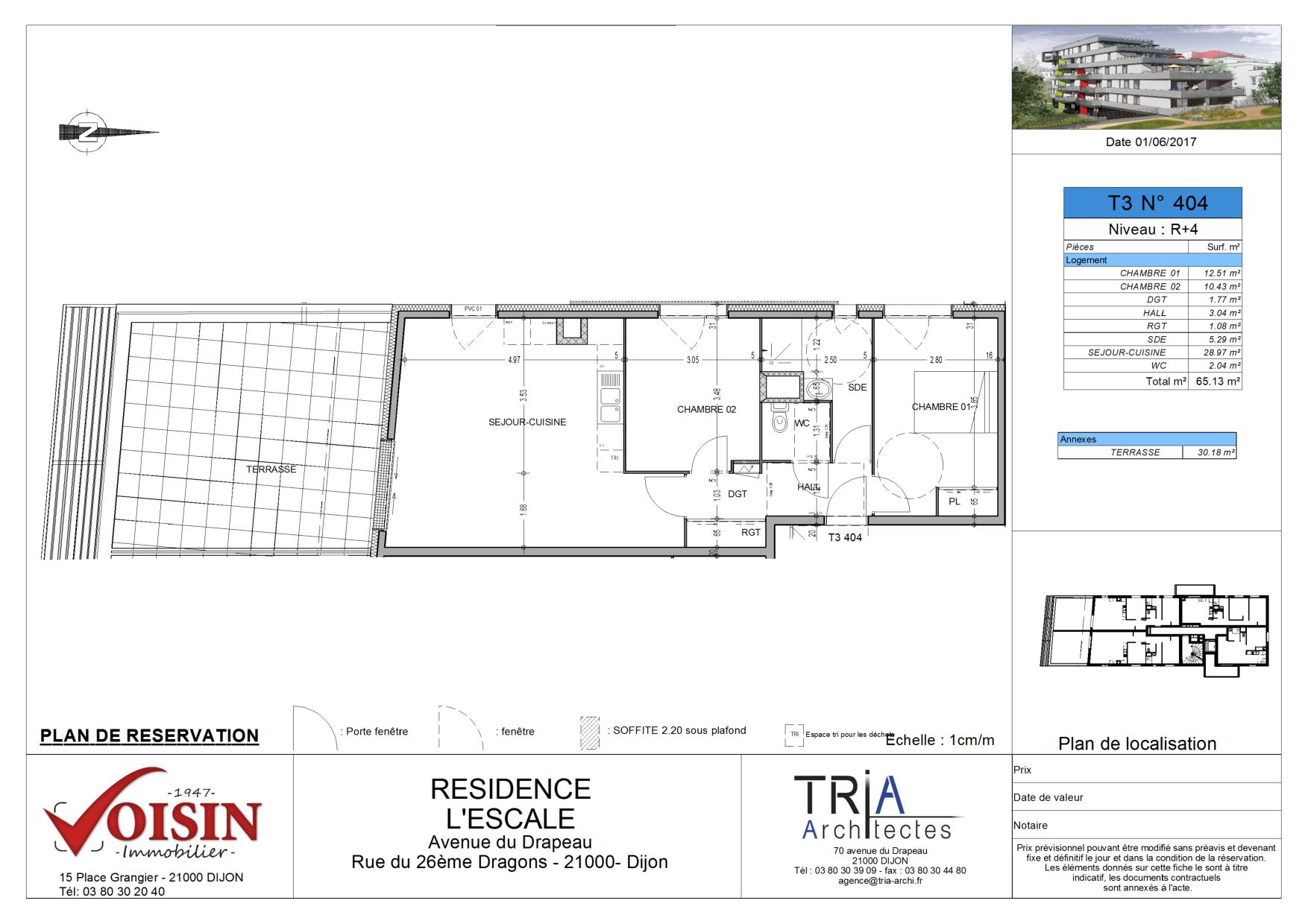 A DIJON, dans la résidence l'ESCALE, au pied du tram, derrière le Grand Dijon. Cet éco quartier piétonnier rend la vie paisible : pas de nuisances sonores tout en ayant toutes les commodités : l'école de commerce est à 2 pas, les commerces également. Nous vous y proposons un appartement T3 (N°404) de 65.13m² situé au 4ème étage. Il se compose d'un hall d'entrée avec dégagement et placard de rangement, d'un séjour-cuisine donnant sur une belle terrasse de 30.18m² exposée sud, de deux chambres de 12.51m² et de 10.43m², d'une salle d'eau avec douche et meuble vasque, WC séparés. Une cave (N°C06). Production de chauffage et eau chaude collectifs urbain. Eau chaude, chauffage, eau froide, entretien parties communes, entretien ascenseur et espaces verts communs, compris dans les provisions sur charges mensuelles et donnant lieu à une régularisation annuelle. - Le montant des honoraires facturés pour 521 EUR TTC et le montant des honoraires de rédaction de l'état des lieux d'entrée 195 EUR TTC