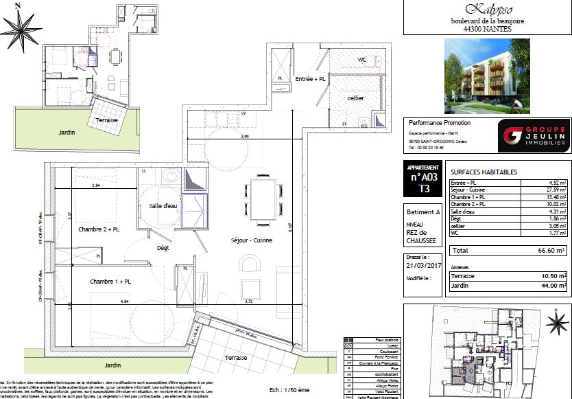 NANTES, Proche de la beaujoire, commerces et commodités, dans la résidence KALYPSO, nous vous proposons un bel appartement de type 3 n°A03 de 66,60m² au rdc du bâtiment A comprenant une entrée, séjour cuisine de 27,59m², salle d'eau, deux chambres avec placards de 13,48m² et 10,02m², wc . Jouissance exclusive d'une terrasse de 10,50m²et d'un jardin 44m² Au sous-sol, une place de parking n°12) Chauffage individuel gaz. Eau chaude et eau froide individuelle. Entretien parties communes, entretien ascenseur et espaces verts communs, compris dans les provisions sur charges mensuelles et donnant lieu à une régularisation annuelle. Les honoraires de location 872 EUR TTC (à la charge du locataire) incluent le montant de rédaction des états des lieux facturé pour 201 EUR TTC, après réalisation lors de l'entrée dans les lieux. Pour plus de détails sur ce logement, vous pouvez consulter la fiche descriptive de ce bien, sur notre site internet Afedim.