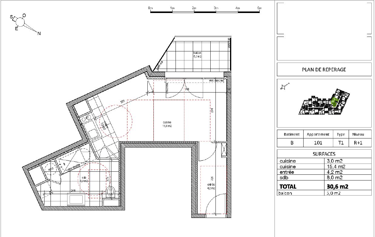 Reims, proche écoles, commerces et loisirs, dans la résidence neuve La Passerelle, nous vous proposons un T1 n°01B101 de 30,60m² avec balcon de 5 m². Situé au 1er étage avec ascenseur, il comprend : une entrée donnant une pièce de vie de 15,4m² avec kitchenette aménagée (hotte, plaque électrique et réfrigérateur) ainsi qu'une salle d'eau avec douche, meuble vasque et WC séparés. Eau chaude et chauffage individuel électrique. Entretien parties communes, ascenseur et espaces verts compris dans les provisions sur charges mensuelles et donnant lieu à une régularisation annuelle. Disponible de suite. Les honoraires de location TTC (à la charge du locataire) incluent le montant de la rédaction des états des lieux facturé pour 91 EUR TTC, après réalisation lors de l'entrée dans les lieux. Pour plus de détails sur ce logement, vous pouvez consulter la fiche descriptive de ce bien, sur notre site internet afedim