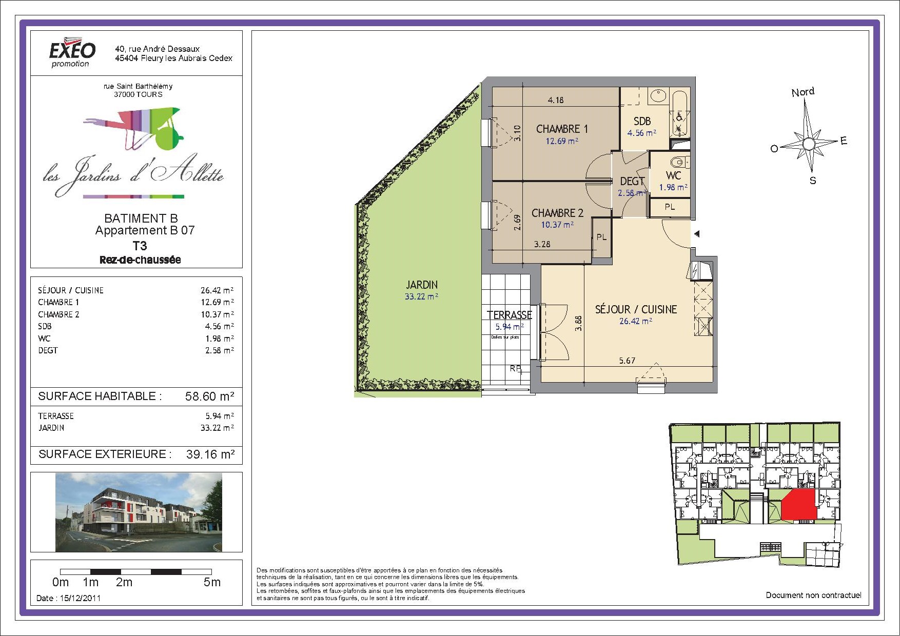 A TOURS, proche de tous commerces et de la gare, dans la résidence neuve LES JARDINS D'ALLETTE, un appartement T3 n°B-07 (lot 107) de 58.60m² avec terrasse de 5.94m² et jardins privatif de 33.22m², au RDC du bâtiment B accessible depuis couloir D, comprenant : un séjour/cuisine aménagée et équipée ( meubles bas et hauts, hotte, four à convection, 4 plaques de cuisson électrique), une salle de bain, un WC, deux chambres. Chauffage gaz avec chaudière à condensation basse température. Au sous sol, une place de parking n°15 (lot 129). Eau froide, entretien parties communes, entretien ascenseur et espaces verts communs, compris dans les provisions sur charges mensuelles et donnant lieu à une régularisation annuelle. Les honoraires de location sont de 468 EUR TTC (à la charge du locataire) et le montant de rédaction des états des lieux est de 175 euros TTC, et facturé après réalisation de l'entrée dans les lieux. SCELLIER INTERMEDIAIRE